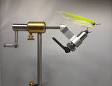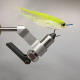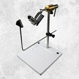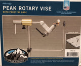The PEAK Rotary Vise is designed with optimal tying efficiency and ease of adjustment and set-up in mind. We use a range of high-quality materials, chosen to last a lifetime, such as stainless steel, brass, and aircraft aluminum. Hardened and tempered tool steel jaws hold hooks securely, from size 2/0 down to the smallest you can buy. Adjustments are accomplished with minimal effort. The large, stable pedestal base will hold this vise where you set it, and the non-marking feet protect any surface from scuffs and scrapes. The steel base is powder coated white for a durable surface that provides a backdrop you can easily see your materials against. The base also includes an integrated hook/bead pocket with rounded edges for ease of removal, and two accessory post mounting holes (accessory post not included). When traveling, loosening a single set screw allows the vise to be removed, and the base is designed to pack flat. The rotation resistance adjustment screw provides infinite adjustment and is easily manipulated by right or left-handed tiers. A height and length adjustable bobbin cradle are supplied with the vise.