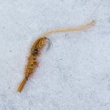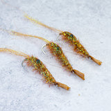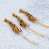A flashy small profile unweighted shrimp imitation. Lands soft and gets bit.
